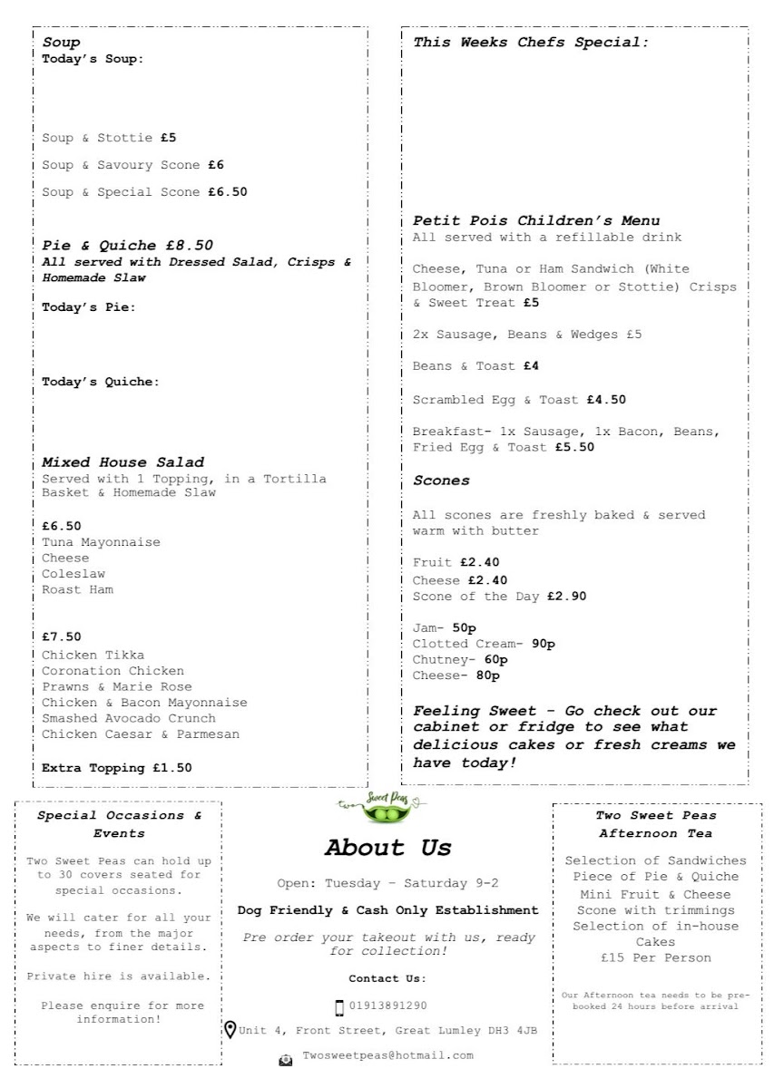 Welcome to Two Sweet Peas Bistro Cafe, a charming spot nestled in Great Lumley, Chester-le-Street. This delightful cafe specializes in a warm atmosphere and a diverse menu that caters to all tastes.